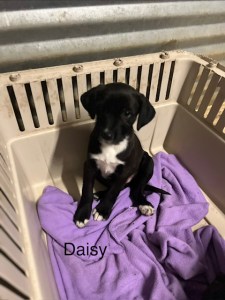 This is daisy approximately born 11/7/25. Around 9/10 weeks old she is very sweet along with her siblings they were found in the woods eating a dead deer to stay alive.. they are very sweet/happy pups now.